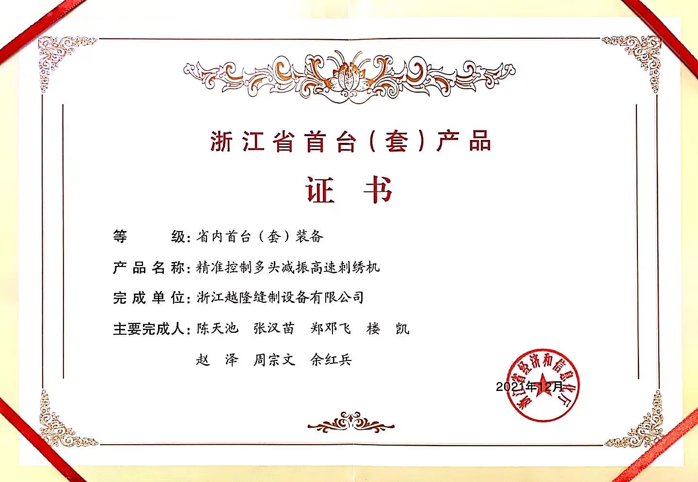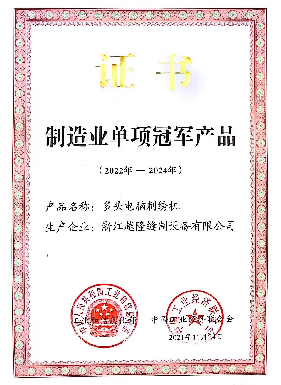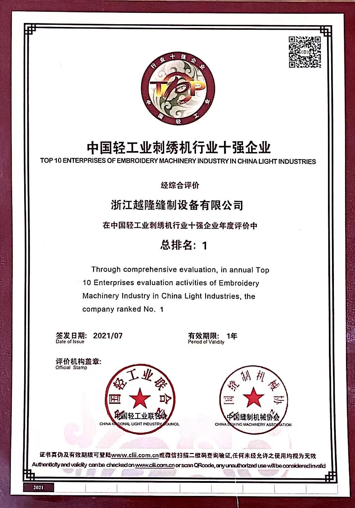 中国軽工業刺繍機業界のトップ10企業にランクイン。中国軽工業設備製造業界のトップ50企業にランクイン。「高速タオル混紡刺繍機」は浙江産ブティックに選ばれました。2インチ独立穴彫りレース多頭刺繍機は「諸曁市イノベーション三等賞」を受賞。「高速インテリジェント刺繍機生産デジタル工房」は諸曁市デジタル変革モデル企業に選ばれました。紹興市2つの新しい組織から「五星双強」を授与されました。