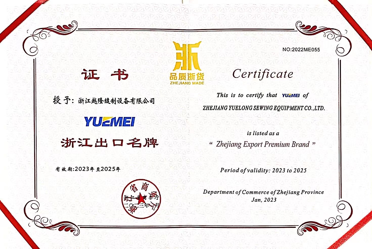 2019年10月、ドイツのKSM社と協力関係を樹立し、各種モジュールの情報ソフトウェアを導入してスマートファクトリーを構築し、「テクノロジー研究開発センター」は浙江省企業技術センター、浙江省工業デザインセンターに認定され、「YUEMEI」ブランドの刺繍機は浙江省輸出有名ブランドに認定され、「フリーホールカービングダブルニードル刺繍機」は浙江産ブティックに認定されました。